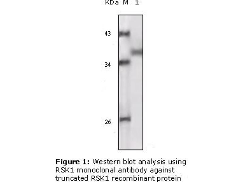 Rsk1 is a member of a family of 90 kDa ribosomal protein S6 kinases, which includes Rsk1, Rsk2 and Rsk3. These are broadly expressed serine / threonine protein kinases activated in response to mitogenic stimuli, including extracellular signal regulated protein kinases Erk1 and Erk2. Rsk1 is activated by MAPK in vitro and in vivo via phosphorylation. Active Rsks appear to play a major role in transcriptional regulation by translocating to the nucleus and phosphorylating c-Fos and CREB. RSK proteins possess two separate kinase domains, the C terminal kinase domain and the N terminal kinase domain, separated by a linker region containing a hydrophobic motif. RSK is activated by many stimuli including growth factors, phorbol esters, cAMP, heat shock, and irradiation.