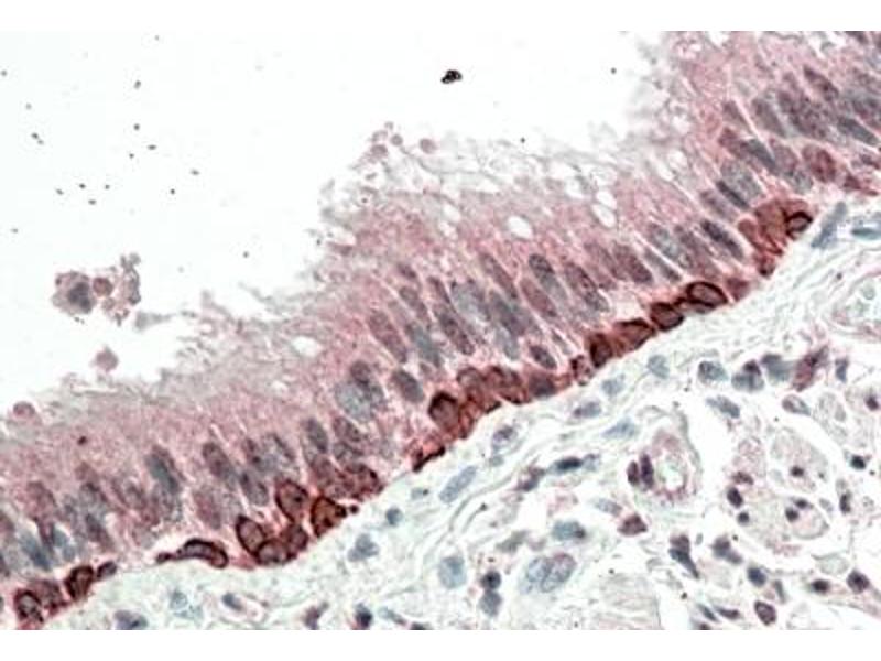 ELISA: Antibody detection limit dilution 1:4000. Western Blot: Approximately 50 kDa band in human skin lysates after 1 μg/mL antibody staining . The 50 kDa band was successfully blocked by incubation with the immunizing peptide. IHC: In paraffin embedded Human Bronchus shows strong nuclear staining in the basal cells of the resporatory epithelium. Recommended concentration, 5-10μg/mL.