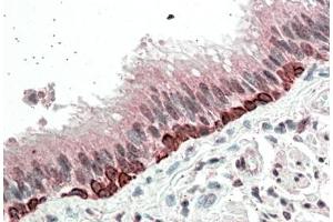 - ELISA: Antibody detection limit dilution 1:4000. Western Blot: Approximately 50 kDa band in human skin lysates after 1 μg/mL antibody staining . The 50 kDa band was successfully blocked by incubation with the immunizing peptide. IHC: In paraffin embedded Human Bronchus shows strong nuclear staining in the basal cells of the resporatory epithelium. Recommended concentration, 5-10μg/mL.
