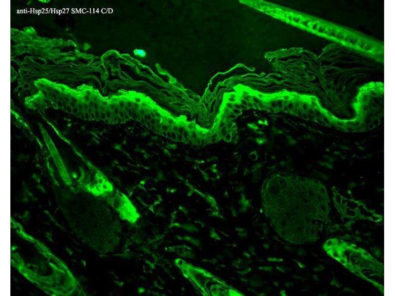 - HSP25 is the mouse homologue of the human HSP27 protein, a member of the small heat shock protein family comprised of a diverse group of proteins from ~15 to >30 kDa(1). The basic structure of most sHSPs is a homologous and highly conserved amino acid sequence, with an α-crystallin-domain at the C-terminus and the WD/EPF domain at the less conserved N-terminus. This N-terminus is essential for the development of high molecular oligomers (2, 3). HSP27-oligomers consist of stable dimers formed by as many as 8-40 HSP27 protein monomers (4). The oligomerization status is connected with the chaperone activity: aggregates of large oligomers have high chaperone activity, whereas dimers have no chaperone activity (5). HSP27 is localized to the cytoplasm of unstressed cells but can redistribute to the nucleus in response to stress, where it may function to stabilize DNA and/or the nuclear membrane. It can be rapidly phosphorylated in response to physiological stimuli relevant to the cell type examined. Thus, HSP27 has been suggested to be an important intermediate in second messenger-mediated signaling pathways (6). Other functions include chaperone activity (as mentioned above), thermo-tolerance in vivo, inhibition of apoptosis, and signal transduction. Specifically, in vitro, it acts as an ATP-independent chaperone by inhibiting protein aggregation and by stabilizing partially denatured proteins, which ensures refolding of the HSP70 complex. HSP27 is also involved in the apoptotic signaling pathway because it interferes with the activation of cytochrome c/Apaf-1/dATP complex, thereby inhibiting the activation of procaspase-9. It is also hypothesized that HSP27 may serve some role in cross-bridge formation between actin and myosin (7). And finally, HSP27 is also thought to be involved in the process of cell differentiation. The up-regulation of HSP27 correlates with the rate of phosphorylation and with an increase of large oligomers. It is possible that HSP27 may play a crucial role in termination of growth (8). For more information visit our HSP27 Scientific Resource Guide at http://www.HSP27.com.