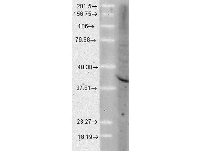 - Detects ~38 kDa. Can run up to 45 kDa on SDS Page.