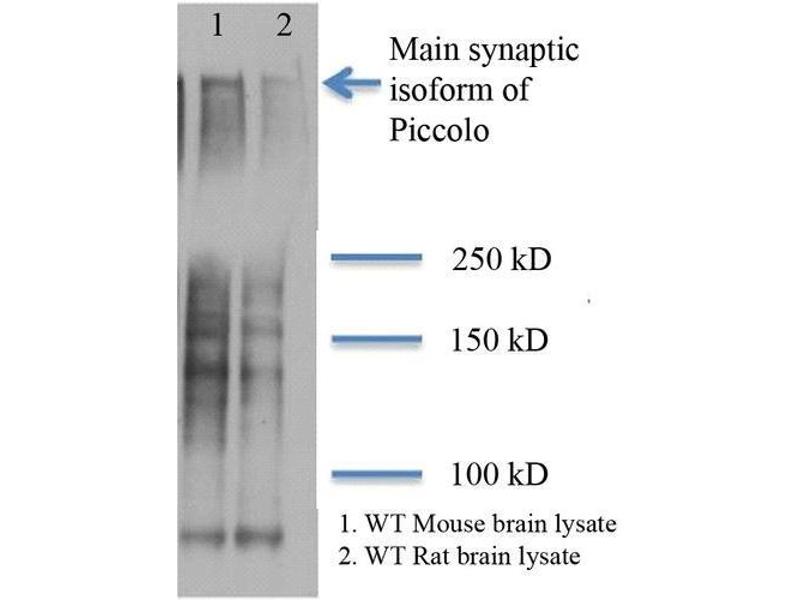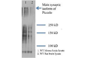 1 μg/ml of ABIN2482374 was sufficient for detection of Piccolo in 20 μg of rat brain tissue lysate by colorimetric immunoblot analysis using goat IgG:HRP as the secondary antibody.