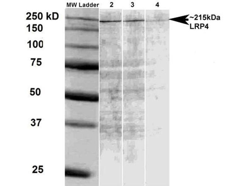 - Detects the extracellular domain of LRP4 ~215 kDa. Degradation product can be seen at ~150 kDa.