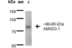 1 μg/ml of ABIN2483813 was sufficient for detection of AMIGO-1 in 20 μg of rat brain membrane lysate and assayed by colorimetric immunoblot analysis using goat anti-mouse IgG:HRP as the secondary antibody.