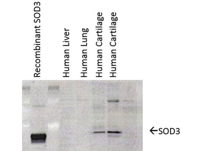 1 μg/ml of ABIN2484275 was sufficient for detection of EC-SOD in 20 μg of human cartilage lysate by colorimetric immunoblot analysis using Goat anti-mouse IgG:HRP as the secondary antibody.