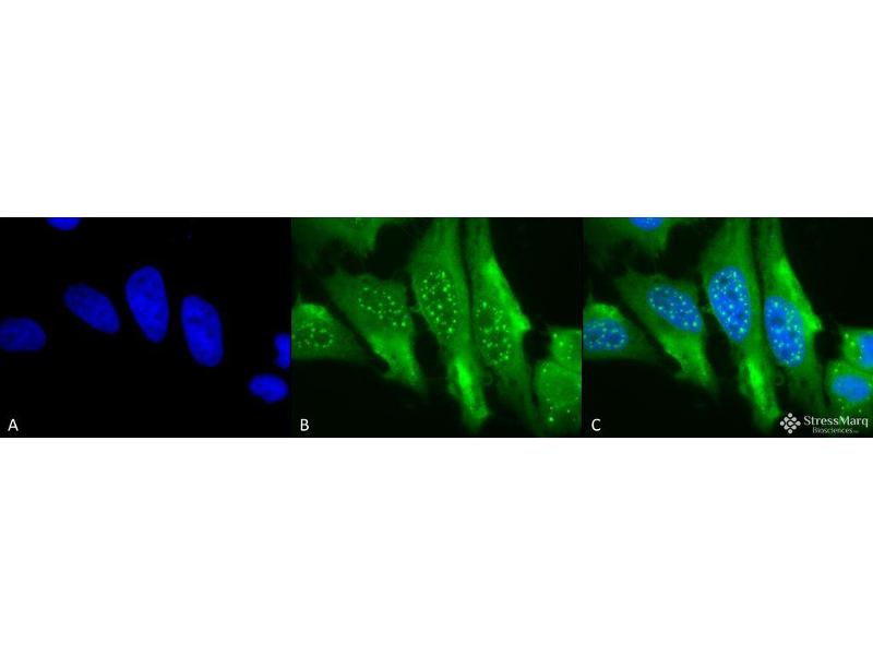 1 μg/ml was sufficient for detection of HO-1 in 10 μg of mixed human cell line lysate by colorimetric immunoblot analysis using Goat Anti-Mouse IgG:HRP as the secondary.