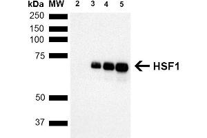 - HSF1, or heat shock factor 1, belongs to a family of Heat Shock transcription factors that activate the transcription of genes encoding products required for protein folding, processing, targeting, degradation, and function (2). The up-regulation of HSP (heat shock proteins) expression by stressors is achieved at the level of transcription through a heat shock element (HSE) and a transcription factor (HSF) (3, 4, 5). Most HSFs have highly conserved amino acid sequences. On all HSFs there is a DNA binding domain at the N-terminus. Hydrophobic repeats located adjacent to this binding domain are essential for the formation of active trimers. Towards the C-terminal region another short hydrophobic repeat exists, and is thought to be necessary for suppression of trimerization (6). There are two main heat shock factors, 1 and 2. Mouse HSF1 exists as two isoforms, however in higher eukaryotes HSF1 is found in a diffuse cytoplasmic and nuclear distribution in un-stressed cells. Once exposed to a multitude of stressors, it localizes to discrete nuclear granules within seconds. As it recovers from stress, HSF1 dissipates from these granules to a diffuse nuceloplasmic distribution. HSF2 on the other hand is similar to mouse HSF1, as it exists as two isoforms, the alpha form being more transcriptionally active than the smaller beta form (7, 8). Various experiments have suggested that HFS2 may have roles in differentiation and development (9, 10, 11).