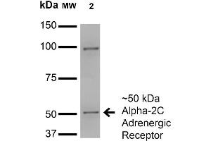 1 μg/ml of ABIN2485201 was sufficient for detection of Alpha2C Adrenergic Receptor in 20 μg of COS cells transiently transfected with HA-tagged Alpha- lysate and assayed by colorimetric immunoblot analysis using goat anti-mouse IgG:HRP as the secondary antibody.