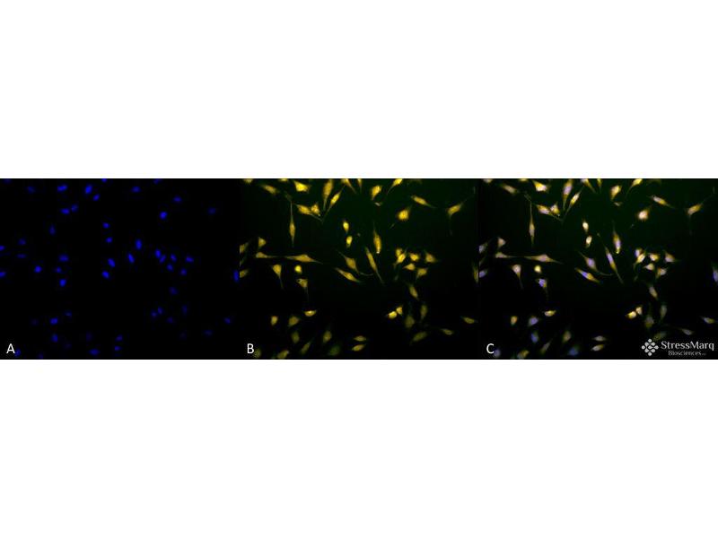 Rab5 is a 24 kDa member of the Rab family of small guanosine triphosphatases (GTPases), Ras superfamily. Rab GTPases are central regulators of membrane trafficking in the eukaryotic cell. Their regulatory capacity depends on their ability to cycle between the GDP -bound inactive and GTP-bound active states. This conversion is regulated by GDP/GTP exchange factors (GEPs), GDP dissociation inhibitors (GDIs) and GTPase-activating proteins (GAPs) (1, 2). Activation of a Rab protein is coupled to its association with intracellular membranes, allowing it to recruit downstream effector proteins to the cytoplasmic surface of a subcellular compartment (3). Through these proteins, Rab GTPases regulate vesicle formation, actin- and tubulin-dependent vesicle movement, and membrane fusion(1). Rab proteins contain conserved regions involved in guanine-nucleotide binding, and hyper variable COHO-terminal domains with a cysteine motif implicated in subcellular targeting. Post-translational modification of the cysteine motif with one or two geranyl groups is essential for the membrane association and correct intracellular localization of Rab proteins(3). Each Rab shows a characteristic subcellular distribution (4). In particular, Rab5 is ubiquitously expressed in human tissues. It localizes mainly to early endosomes, but is also present on the plasma membrane. It regulates the fusion between endocytic vesicles and early endosomes, as well as the homotypic fusion between early endosomes (5). Among the proteins recruited by the GTP-bound active Rab5 are Rabaptin-5 and EEA1 (6). Anti-Rab5 may be used as an early endosome marker.