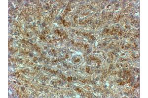 Immunohistochemistry: In paraffin embedded Human Liver shows textured cytoplasm staining in hepatocytes. Recommended concentration, 2-4 μg/mL.