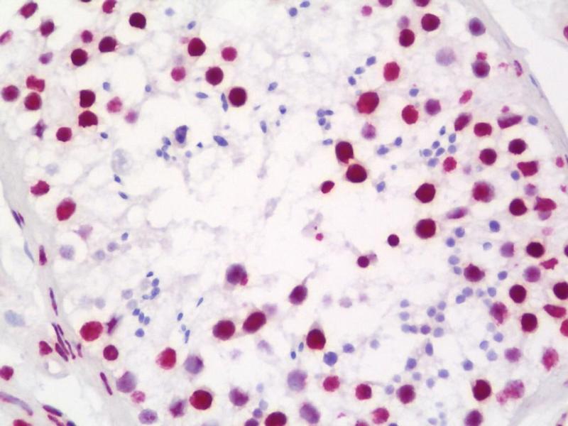 Usage: Immunohistochemistry: Antigen retrieval is recommended. Antigen retrieval with citrate buffer will enhance staining. Likely to work with frozen sections. In some cases, the antibody may be diluted further than indicated. Human controls: Breast Carcinoma, Colon Carcinoma, Laryngeal Squamous Cell Carcinoma, Linitis Plastica Stomach Cancer, Lung Adenocarcinoma, Metastatic Lym pH Node, Non-Small Cell Lung Cancer, Ovarian Carcinoma, Pancreatic Islet Cell Tumor, Prostate Carcinoma, Skin Basal Cell Carcinoma, Skin Squamous Cell Carcinoma, Small Cell Lung Cancer, Stomach Adenocarcinoma, Testicular Seminoma. Mouse controls: Squamous Cell Carcinoma. -