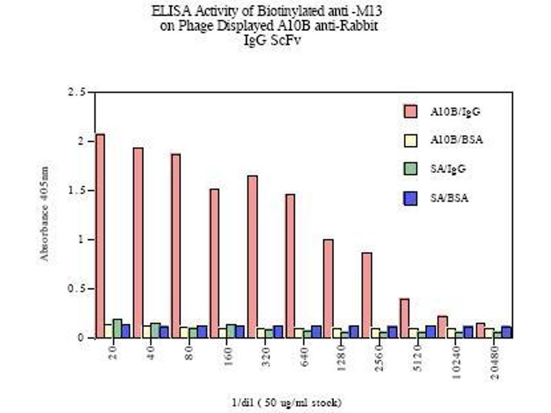 The display of repertoires of antibody fragments on the surface of filamentous phage offers a new way to produce immunoreagents with defined specificities. Phage derived antibody fragments offer a number of advantages over mouse monoclonal antibodies, such as better clearance from the blood, the possibility to select from human combinatorial libraries and the relative ease by which such fragments can be manipulated. The phage display technique thus facilitates the selection of antibody fragments of therapeutic value or research interest. Antibodies to M13 filamentous phage coat proteins are instrumental in the selection and detection of phages expressing specific antibody fragments or peptide sequences at their surface.Synonyms: Attachment protein G3P, Gene 3 protein, Minor coat protein A