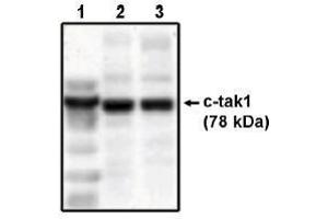 Western Blot: 1 to 5 μg/mL. Detects c-tak1 in RKO and HCT116 cell lysatesPOSITIVE CONTROL: Recombinant His-tagged C-TAK1 protein. Other applications not tested. Optimal dilutions are dependent on conditions and should be determined by the user.