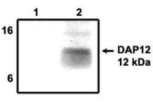 DAP12 is a transmembrane adaptor protein that is non-covalently associated with several cell surface receptors on natural killer (NK), myeloid, and presumably neuronal cells (1,2). DAP12 contains an ITAM domain that preferentially recruits the protein tyrosine kinase Syk to initiate signal transduction (3). Deficiency of DAP12 results in reduced antigen presentation function by myeloid cells and defects in function of certain NK cell receptors in mice (4,5), as well as presenile dementia and bone cysts in humans (6).Synonyms: DNAX-activation protein 12, KARAP, Killer-activating receptor-associated protein, TYRO protein tyrosine kinase-binding protein