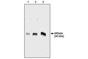 The receptor for Signal Recognition Particle (SRP) is the site on the endoplasmic reticulum that ribosomes translating secreted and integral membrane proteins are initially targeted to. Once the ribosome-SRP complex arrives at the SRP receptor the protein being translated is transferred to the translocation complex (Sec61) in the ER membrane. The SRP receptor is composed of two subunits SRalpha and SRbeta. The SRalpha subunit is a translocation GTPase peripherally bound to the endoplasmic reticulum by its interaction with SRbeta. SRalpha also binds to the GTPase of SRP (SRP54) and these two proteins appear to function as each others GTPase activating proteins (GAPs). Hydrolysis of GTP by SRalpha and SRP54 is thought to be involved in transfer of the nascent protein to the Sec61 complex in the ER. SRalpha has an apparent molecular weight of 72 kDa. SRbeta is a Type I transmembrane protein that spans the membrane once and contains Ras type GTPase domain. The function of the GTPase in SRbeta is unknown. The membrane spanning domain is at the amino-terminus of SRbeta. The GTPase domain encompasses three quarters of the protein and is carboxyl- of the transmembrane region. SRalpha binds to the GTPase domain of SRbeta. Heterodimerization of SRalpha and SRbeta masks the carboxyl-terminal epitope of SRbeta.Synonyms: APMCF1, PSEC0230, SR beta, SRPRB, Signal recognition particle receptor subunit beta