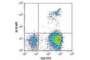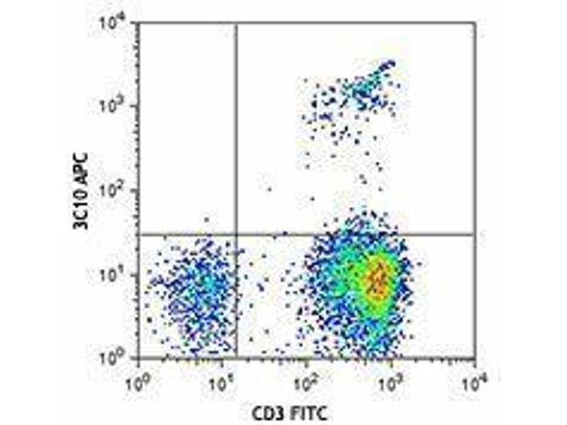 The 3C10 antibody recognizes the Vα7.2 T cell antigen receptor (TCR) α -chain segment which, joined with the Jα33 segment, constitutes an invariant TCR that is characteristics of the mucosal-associated invariant T cells (MAIT cells). MAIT cells are restricted by a nonpolymorphic class Ib major histocompatibility complex (MHC) molecule, MHC-related molecule 1 (MR1). MAIT cells are present in human blood (1-8 % of T cells), mesenteric lymph nodes, liver, and intestinal mucosa. MAIT cells play a role in detecting and fighting off microbial infections.
