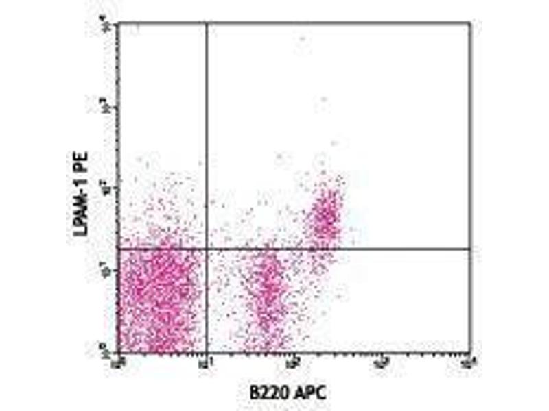 DATK32 antibody is specific for a combinatorial determinate of integrin α4 β7complex. Integrin α4β7 is composed of a 150 kD (α4 or CD49d) and a 130 kD (β7) heterodimer, also known as CD49d/β7 or LPAM-1. Belonging to the Ig superfamily, it is found on the majority of peripheral lymphocytes and subsets of thymocytes and bone marrow cells (including mast cell progenitors). Integrin α4β7 binds its ligands, VCAM-1 (CD106), MAdCAM-1 and fibronectin, and plays an important role in lymphocytes adhesion and the direction of migration of blood lymphocytes to the intestine and associated lymphoid tissues.