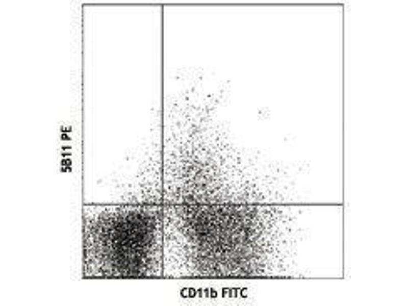CD123 is a 70 kD α chain subunit of the IL-3 receptor (IL-3R α). It is a member of the immunoglobulin superfamily that is expressed on hematopoietic progenitors, basophils, mast cells, and megakaryocytes. This transmembrane glycoprotein can bind IL-3 with low affinity but cannot transduce signals without association with additional protein partners. CD123 can complex with either the common β chain (CDw131) or the IL-3R β chain (AIC2A) to form high-affinity heterodimeric IL-3 receptors. CDw131 can complex with the α subunits of the mouse IL-3R, IL-5R and GM-CSFR to form high-affinity receptors, while the IL-3 R β subunit is specific for IL-3 but binds with low affinity. IL-3 binding to the receptor complex can induce proliferation and differentiation of hematopoietic cells. The 5B11 antibody does not block binding of IL-3 to the high affinity IL-3 receptor.