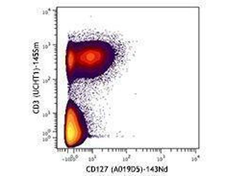 - CD127 is a 60-90 kD type I transmembrane glycoprotein also known as IL-7 receptor α chain or IL-7Rα. It forms a heterodimer with the common γ chain (γc or CD132) which is shared with the receptors for IL-2, IL-4, IL-9, IL-13, IL-15, and IL-21. CD127 is expressed on immature B cells through early pre-B stage cells, thymocytes (except CD4/CD8 double positive thymocytes), peripheral T cells, and bone marrow stromal cells. CD127 has been reported to be a useful marker for identifying memory and effector T cells. Studies have shown that CD127 expression is down-modulated on Treg cells. It can be used as a marker for differentiation of Treg and conventional T cells. The ligation of IL-7 with its receptor is important for stimulation of mature and immature T cells as well as immature B cell proliferation and development.