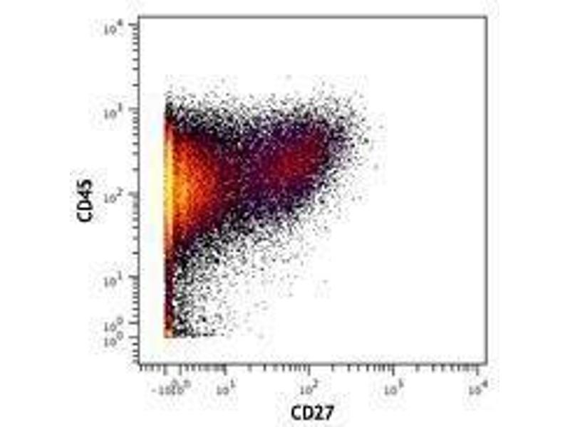 CD27 is a 50-55 kD type I membrane protein also known as S152 and T14. It is a lymphocyte-specific member of the TNF-receptor superfamily. CD27 is expressed on medullary thymocytes, virtually all mature T cells, some B cells, and NK cells. CD27 binds to CD70 and plays an important role in costimulation of T cell activation, and regulation of B cell differentiation and proliferation. The cytoplasmic domains of CD27 have also been shown to interact with TRAF2 and TRAF5 to elicit NF-κB and SAPK/JNK activation.