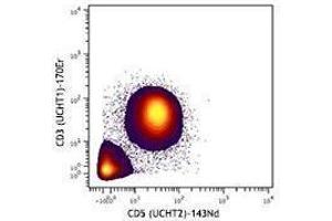 CD5 is a 67 kD single chain type I glycoprotein also known as Leu-1, Ly-1 and T1. It is a member of the scavenger receptor superfamily found on T cells, thymocytes, B cell subsets, chronic B lymphocytic leukemia (B-Cells), and peripheral blood dendritic cells. CD5 modulates T and B cell receptor signaling, thymocyte maturation, and T-B cell interactions upon binding to ligands such as CD72.