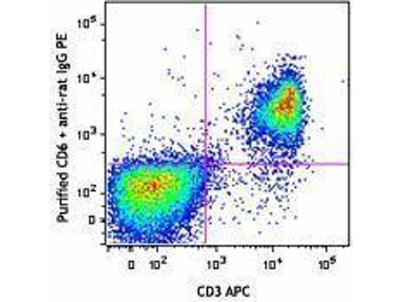 - CD6, a 100 kD monomeric T cell surface glycoprotein, is a member of the scavenger receptor cysteine-rich protein superfamily. It is expressed on mouse thymocytes and splenic T cells and neurons, but not on splenic B cells. CD6 has a long cytoplasmic tail in mice, with two proline-rich domains that interact with the -SH3 domain binding sequence. CD6 binding to its ligand, CD166 (ALCAM), serves as a costimulatory molecule through its interaction with SLP-76. CD6 mediated signaling may contribute to thymocyte survival and functional avidity in mice and men.