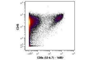 CD8, also known as Lyt-2, Ly-2, or T8, consists of disulfide-linked α and β chains that form the α(CD8a)/β(CD8b) heterodimer and α/α homodimer. CD8a is a 34 kD protein that belongs to the immunoglobulin family. The CD8 α/β heterodimer is expressed on the surface of most thymocytes and a subset of mature TCR α/β T cells. CD8 expression on mature T cells is non-overlapping with CD4. The CD8 α/α homodimer is expressed on a subset of γ/δ TCR-bearing T cells, NK cells, intestinal intraepithelial lymphocytes, and lymphoid dendritic cells. CD8 is an antigen co-receptor on T cells that interacts with MHC class I on antigen-presenting cells or epithelial cells. CD8 promotes T cell activation through its association with the TCR complex and protein tyrosine kinase lck.