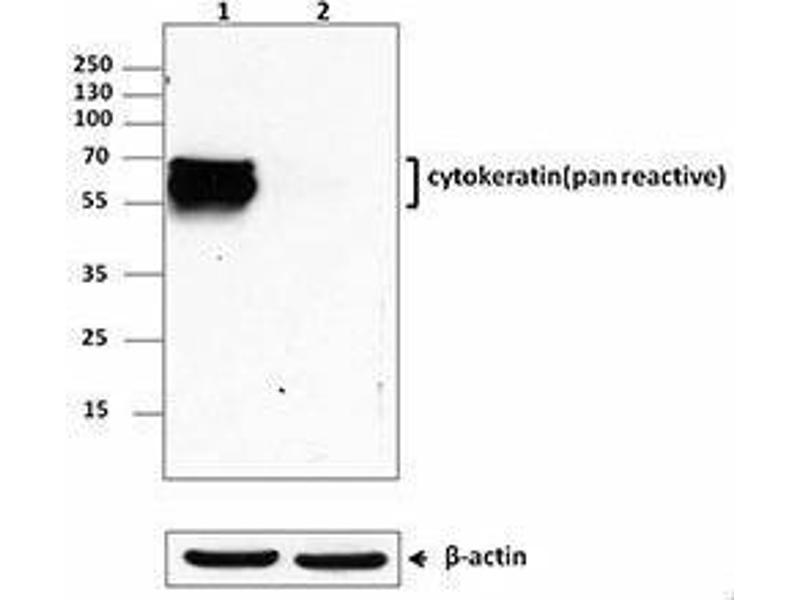Reacts with conserved epitope in all species tested. Recognizes cytokeratin 4, 5, 6, 8, 10, 13, and 18.