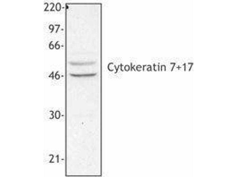 - Cytokeratins are proteins that are involved in the cytoskeleton. The cytokeratin proteins are heterotetramers composed of two type I and two type II subunits. Cytokeratin 17 is a type I protein and cytokeratin 7 is a type II intermediate filament protein, each protein contains three coiled-coil domains. Cytokeratin 7 has an approximate molecular weight of 54 kD, cytokeratin 17 has an approximate molecular weight of 46 kD. Cytokeratin 17 is expressed in the basal cells of complex epithelia, but not in stratified or simple epithelia. Cytokeratin 7 is expressed in the epidermis, bronchus, and mesothelium but not in the colon, exocervix or liver. Mutations in cytokeratin 17 have been shown to result in pachyonychia congenital. Cytokeratin 17 has been shown to interact with the EGF receptor. Cytokeratin 7 has been shown to interact with the EGF receptor and heat shock protein 70 kD1A. The C-46 monoclonal antibody recognizes human, bovine and porcine (but not mouse, rat, or rabbit) cytokeratin 7 and cytokeratin 17 and is useful for Western blotting.This antibody has also been reported to be useful for immunoprecipitation, immunohistochemistry (paraffin sections), and immunocytochemistry.