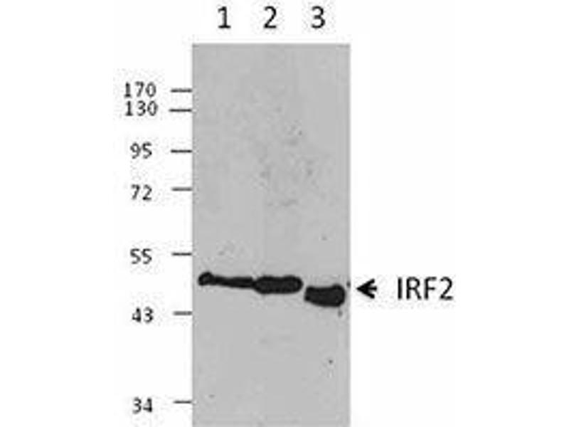 IRF2 is a member of the IRF family of transcription factors, mainly functioning as a transcriptional repressor. It binds to the interferon-sensitive response elements (ISREs) and competes for binding sites with the other IRF transcription factors, such as IRF1 and IRF9. Mice deficient in IRF2 spontaneously develop skin inflammation due to excessive activation of CD8+ T lymphocytes. Further, the severely reduced number of mature NK cells in IRF2-deficient mice suggests that IRF2 is required for normal NK cell development. IRF2 contains a latent activation domain that can act as a transcriptional activator and has been revealed to positively regulate Histone H4 and VCAM-1 gene expression.