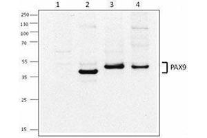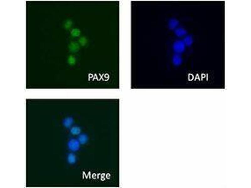 PAX9 is a transcription factor belonging to the PAX family, which is composed of nine members defined by the presence of a paired box domain responsible for DNA binding. PAX9 is expressed at the E10 stage and downregulated at the bell stage. It is controlled by Fgf/Bmp signaling and plays an essential role in tooth development. PAX9 deficient mice fail to form teeth and show developmental arrest at the bud stage. In humans, heterozygous mutation in PAX9 is associate with tooth agenesis. These findings support the role of PAX9 in tooth development.
