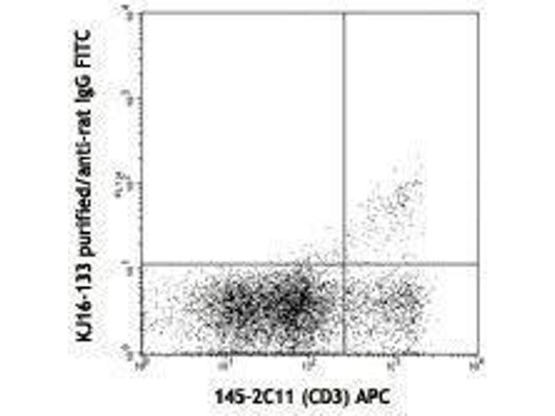 The TCR Vβ 8 family consists of three members, namely Vβ8.1, 8.2 and 8.3. KJ16-133.18 reacts with Vβ8.1, 8.2 only, but not Vβ8.3. Most mouse strains have about 20 % Vβ 8+ T cells in the periphery.However, C57BR, C57L, SJL, SWR (Tcra haplotype) and RIII strains (Tcrc haplotype) do not express Vβ8 due to a gene deletion at the Vβ 8 family loci.Other strains expressing endogenous super-antigen, such as Mls-1a have significant reduced number of Vβ 8.1 cells in the periphery.Exogenous superantigen, such as staphylococcal enterotoxin B, stimulates lymphocytes bearing Vβ 8 and selectively eliminate those T cells in vivo.