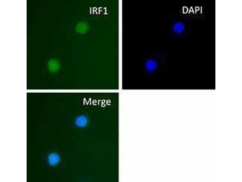 IRF1 is the first identified member of the interferon regulatory transcription factor family. Its expression is induced in response to pathogen infection or the stimulation of several cytokines, including type I and II IFN, IL-1, IL-6, and TNF-α. Upon stimulation, IRF1 is transcriptionally activated by STAT1 and NFκB transcription factors via the GAS (interferon-gamma-activated sequence) element in the IRF1 promoter. IRF1 plays important roles in mediating immune response during infection and development of T cells and NK cells. In addition to the immunomodulatory functions, IRF1 has also shown to be involved in the regulation of cell cycle progression, tumor suppression, and apoptosis. IRF1-mediated transcription can be repressed by IRF2 through competing for the same binding region on the promoters.