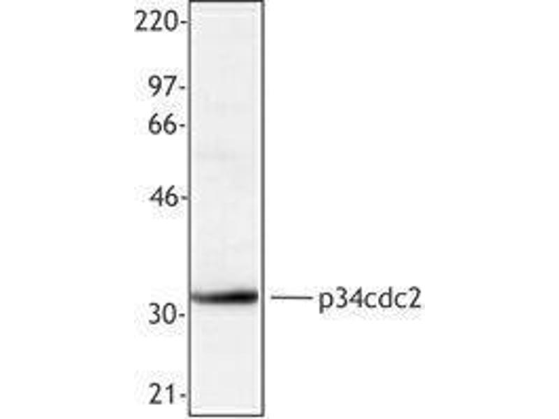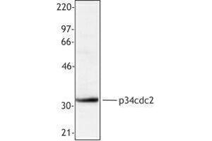 Cdc2 (p34), also known as cell division cycle 2, G1 to S and G2 to M, cyclin dependent kinase 1, p34 kinase, and CDK1, is serine/threonine kinase that is ubiquitously expressed in eukaryotes. Cdc2 is found as both a cytoplasmic and nuclear protein. cdc2 is a catalytic subunit of a protein kinase called the M-phase promoting factor that induces entry into mitosis universally in eukaryotes. The cdc2 protein is highly phosphorylated on threonine, serine, and tyrosine, tyrosine phosphorylation is subject to cell cycle regulation. Cdc2 has been shown to interact with numerous proteins including cyclin A1, cyclin A2, cyclin B1, cyclin B2, BRCA1, dynamin 2, Fyn, Lyn, and p53. The POH-1 antibody recognizes human, monkey and bovine cdc2 and is useful for Western blotting. The POH-1 antibody has also been reported to be useful for immunoprecipitation, immunohistochemistry (formalin-fixed, paraffin embedded), and immunofluorescence.