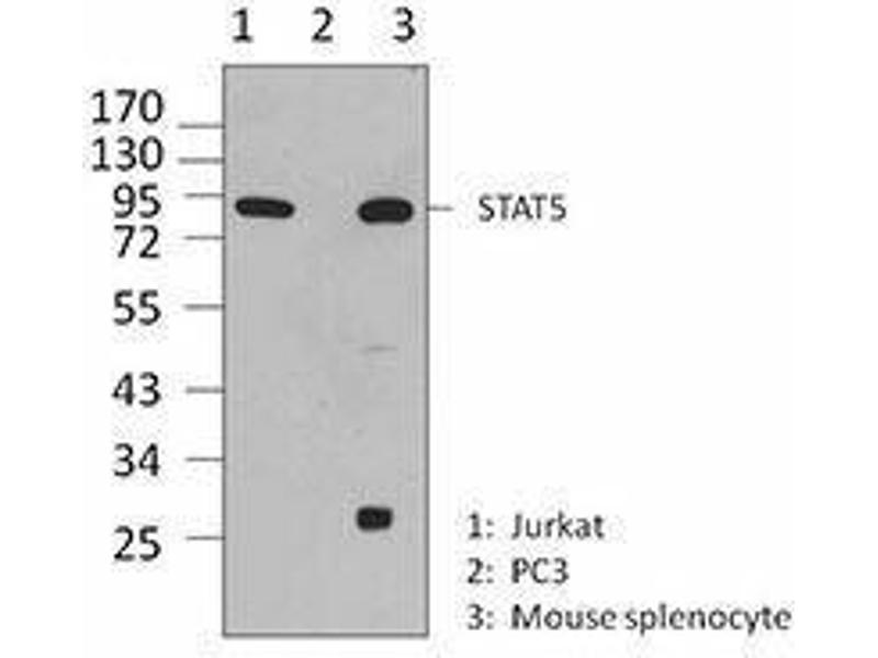 - STAT5 is a member of the signal transducer and activator of transcription factors (STAT) family, mediating growth and cytokine signaling. STAT5 consists of two closely related family members, STAT5A and STAT5B, which exhibit 96 % sequence homology and are functionally redundant. Upon activation, STAT5 is phosphorylated by receptor tyrosine kinases and, in turn, forms homodimers or hererodimers with other family members through its SH2 domains. The dimerized STAT5 translocates to the nucleus and binds to the STAT5 response element (TTCXXXGAA). STAT5 plays crucial regulatory roles in cell proliferation, anti-apoptosis, early B cell differentiation, and T cell development.