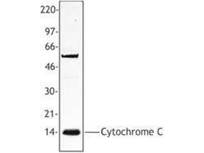 - Cytochrome c is a 15 kD protein found in the mitochondrial intermembrane space with a heme-binding domain. Cytochrome c is a component of the electron transport chain, the heme group transfers electrons from cytochrome b-c1 complex to cytochrome oxidase complex. Cytochrome c initiates apoptosis by release to cytoplasm and binding Apaf-1 which activates procaspase 9. Cytochrome c interacts with the cytochrome b-c1 complex, cytochrome oxidase complex, heme, Apaf-1, and Caspase 9 proteins. The 7H8.2C12 monoclonal antibody recognizes cytochrome-c from most species and has been shown to be useful for Western blotting.