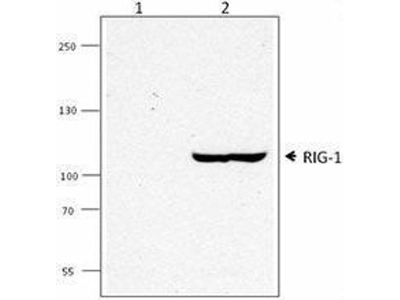 RIG-1/DDX58(Retinoic acid-inducible gene 1 protein/ DEAD-box protein 58) is an RNA helicase that belongs to the DEAD/H box. Contains 2 CARD domains, a helicase ATP-binding domain and a helicase C-terminal domain. Predicted molecular weight approximately 107 kD. RIG-1 has an essential function in double-stranded RNA-induced innate antiviral responses. RIG-1 and MDA5 (melanoma differentiation-associated gene 5) are key intracellular receptors that sense intracellular viral infection and trigger a signal forinnate antiviral responses including the production of typeI IFN. Clone SS1A has been shown to be useful for western blotting of the mouse RIG-1 protein.