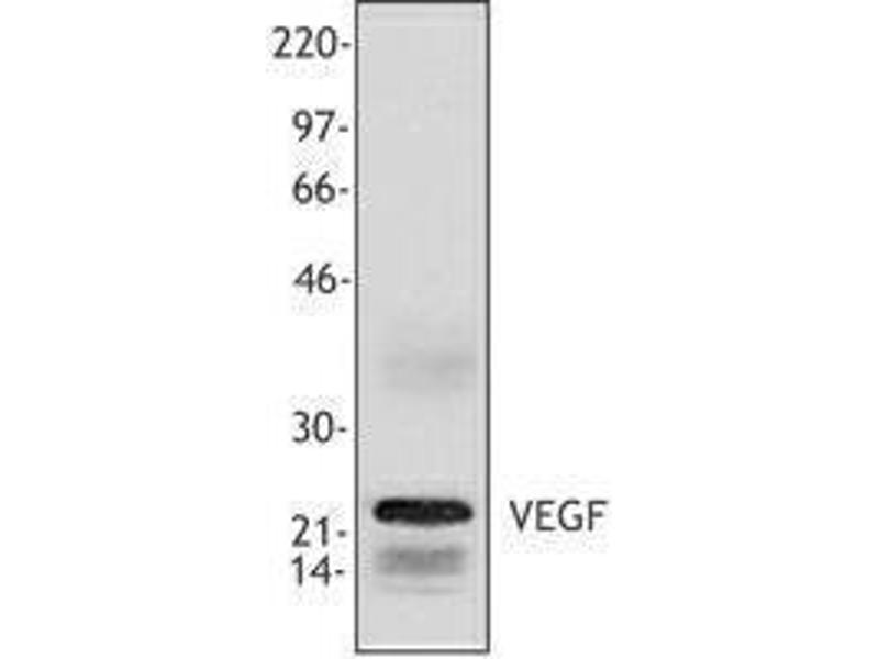 VEGF, also known as vascular endothelial growth factor, vasculotropin, and vascular permeability factor, is a widely expressed mitogen for vascular endothelial cells that has been shown to promote angiogenesis and increase permeability of capillary blood vessels. VEGF is a member of the platelet-derived growth factor (PDGF) family and is produced as a homodimeric protein with approximate molecular weights of 34-46 kD. The variance in molecular weight is a result of alternative splicing events that encode monomeric proteins having 121, 165, 189 or 206 amino acids. VEGF121 and VEGF165 are secreted proteins whereas VEGF189 and VEGF206 are strongly cell-associated. VEGF binds to VEGF-R1 (also known as Flt-1) and VEGF-R2 (also known as KDR). Inhibition of VEGF biding to VEGF-Rs has been the focus of a number of tumor therapeutic strategies. The Poly6275 antibody recognizes the N-terminal region of human VEGF has been shown to be useful for Western blotting of both reduced and non-reduced VEGF.