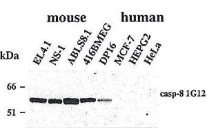 - Recognizes the p20 subunit of mouse caspase-8. Detects bands of ~55 kDa (full-length caspase-8) and ~18 kDa (apoptosis-induced cleavage fragment) by Western blot.