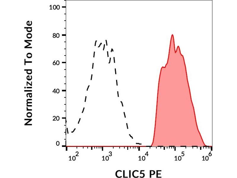 Mouse monoclonal antibody CLIC5-02 recognizes CLIC5a, a 32 kDa intracellular protein which associates with proteins of actin complexes. Crossreactivity with CLIC5b was not determined.