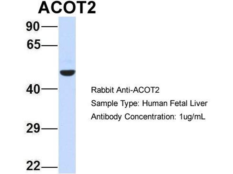 - This is a rabbit polyclonal antibody against ACOT2. It was validated on Western Blot using a cell lysate as a positive control.