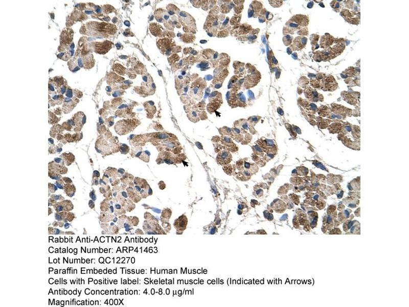 - The immunogen is a synthetic peptide directed towards the C terminal region of human ACTN2