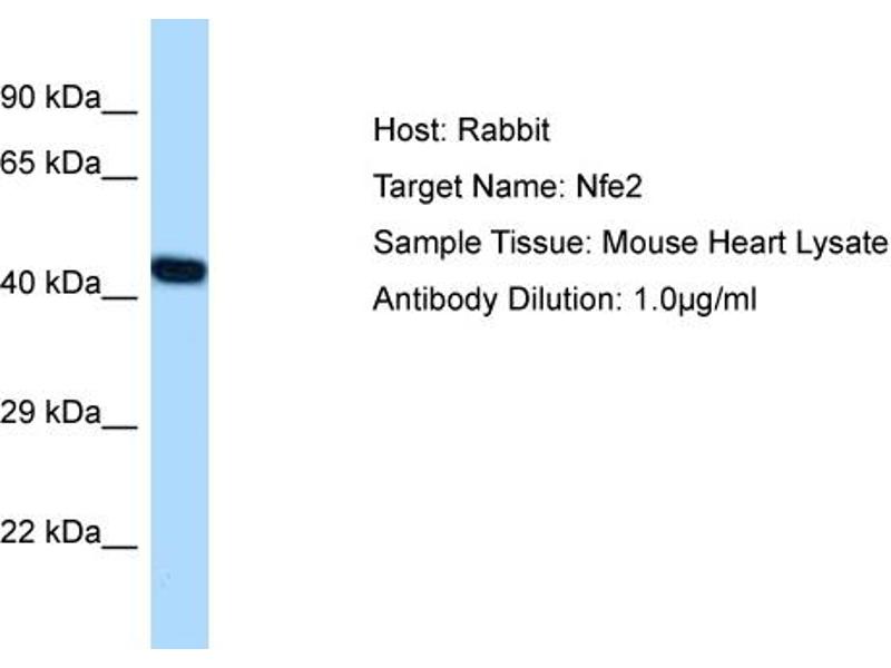Nfe2 is a component of the NF-E2 complex essential for regulating erythroid and megakaryocytic maturation and differentiation.It binds to the hypersensitive site 2 (HS2) of the beta-globin control region (LCR). This subunit (NFE2) recognizes the TCAT/C sequence of the AP-1-like core palindrome present in a number of erythroid and megakaryocytic gene promoters. It requires MAFK or other small MAF proteins for binding to the NF-E2 motif. It may play a role in all aspects of hemoglobin production from globin and heme synthesis to procurement of iron. Alias Symbols: 45 kDa, NF-E2, p45, p45NFE2, p45nf-e2 Protein Interaction Partner: Psmd4, Kmt2d, Rbbp5, Wdr5, Ash2l, Men1, Mafk, H3f3a, Crebbp, Mapk8, Trip4, Plrg1, Pdlim4, Zfp292, Gtf2h2, Zscan2, Ubp1, Tsg101, Tial1, Supt4a, Snai1, Kdm5d, Kdm5c, Dpf2, Per1, Kat2b, Mybbp1a, Orc2, Ikbkg, Hoxb4, Hoxa4, Hcls1, Gtf2h1, Foxn2, E4f1, Dlx5, Ci Protein Size: 373