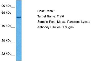 TRAF6 is an E3 ubiquitin ligase that, together with UBE2N and UBE2V1, mediates the synthesis of 'Lys-63'-linked-polyubiquitin chains conjugated to proteins, such as IKBKG, AKT1 and AKT2. It also mediates ubiquitination of free/unanchored polyubiquitin chain that leads to MAP3K7 activation. Leads to the activation of NF-kappa-B and JUN. It may be essential for the formation of functional osteoclasts. It seems to also play a role in dendritic cells (DCs) maturation and/or activation. It represses c-Myb-mediated transactivation, in B-lymphocytes. Adapter protein that seems to play a role in signal transduction initiated via TNF receptor, IL-1 receptor and IL-17 receptor. It regulates osteoclast differentiation by mediating the activation of adapter protein complex 1 (AP-1) and NF-kappa-B, in response to RANK-L stimulation. Alias Symbols: MGC:3310, RNF85 Protein Interaction Partner: YES1, UBE2V1, UBE2N, UBE2L3, UBE2E1, UBE2D2, UBE2D1, POLI, UBC, IL1R1, EDARADD, PLEKHF2, LAT, TRAF3IP2, PPP4R1, USP2, IKBKG, TRAF6, TRAF5, TRAF2, TRAF1, CNTN2, SYK, VPS52, PSEN1, LGMN, MEOX2, MCL1, CANX, nef, TAB2, OTUD7A, GTF2I, KRAS, DCBLD2, MAP3K7, EIF Protein Size: 522