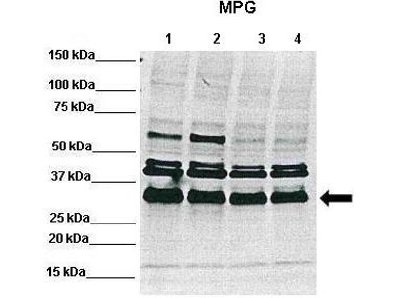 - This is a rabbit polyclonal antibody against MPG. It was validated on Western Blot using a cell lysate as a positive control.