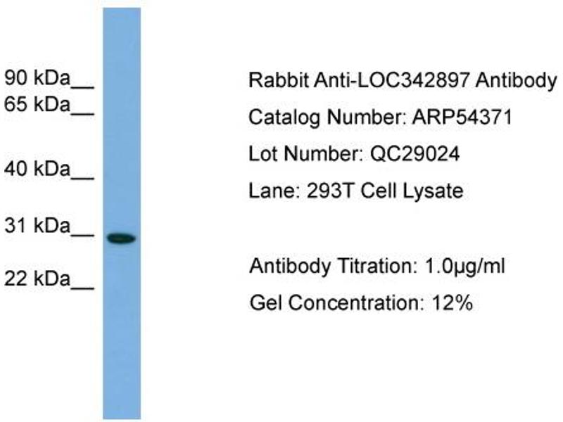 - This is a rabbit polyclonal antibody against LOC342897. It was validated on Western Blot using a cell lysate as a positive control.