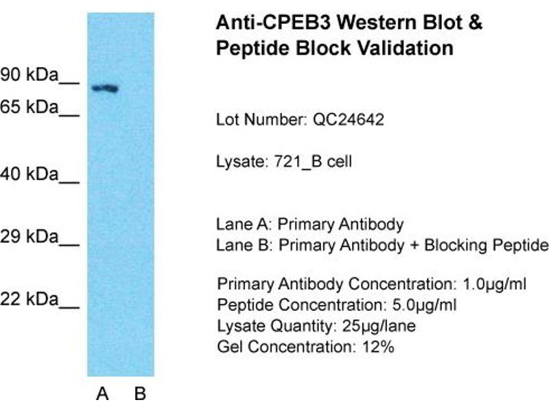 - This is a rabbit polyclonal antibody against CPEB3. It was validated on Western Blot using a cell lysate as a positive control.