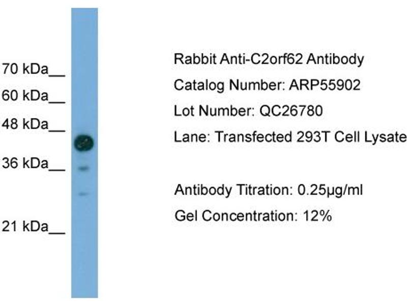 - This is a rabbit polyclonal antibody against C2orf62. It was validated on Western Blot.