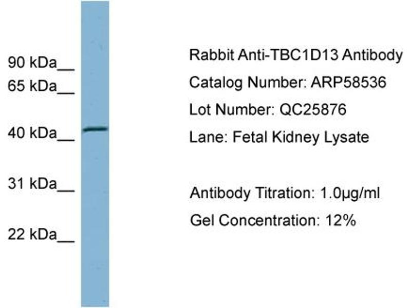 - This is a rabbit polyclonal antibody against TBC1D13. It was validated on Western Blot using a cell lysate as a positive control.