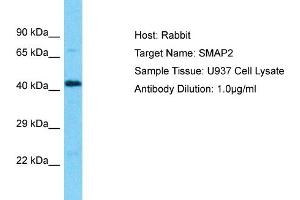 SMAP2 is a GTPase activating protein that acts on ARF1. It can also activate ARF6 and may play a role in clathrin-dependent retrograde transport from early endosomes to the trans-Golgi network. Alias Symbols: RP1-228H13.3, SMAP1L Protein Interaction Partner: C1orf94, FAM168A, DAZAP2, MAGED1, DAB1, UBC, VCAM1, FN1, Protein Size: 429